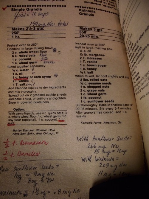 One of my many favorite things about my mom is how she has always written notes in her cookbooks to record her life. She first tried the Simple Granola recipe on 12-15-1981 when I was just 3 years old… I made a batch this afternoon with a few substitutes that came out pretty awesome. Instead of 1 cup of honey, I used 1 cup of maple syrup from a family friends farm in Michigan with 1 package of broken walnuts…